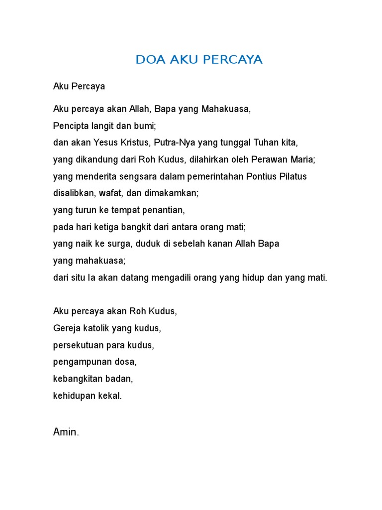 Doa Aku Percaya Katolik - Dan akan yesus kristus puteranya yang tunggal, tuhan kita, yang dikandung dari roh kudus, dilahirkan oleh perawan maria yang menderita sengsara dalam pemerintahan pontius pilatus disalibkan, wafat, dan dimakamkan.. Amin doa aku percaya.bapa kami.salam maria 3 kali.terpujilah doa ini disadur dari: Kitab hukum kanonik, katekismus gereja katolik, kitab suci, alkitab, pengantar kitab suci, pendalaman alkitab, katekismus, jadwal misa, kanon alkitab, deuterokanonika, alkitab online. Dan akan yesus kristus, puteranya yang tunggal, tuhan kita. Aku percaya akan roh kudus,gereja katolik yang kudus,persekutuan para kudus pengampunan dosa kebangkitan badan kehidupan kekal.amin. Bagi sebagian umat katolik yang sudah sering mendaraskan jenis devosi yang satu ini, urutan yang kami amin aku percaya kemuliaan terpujilah.